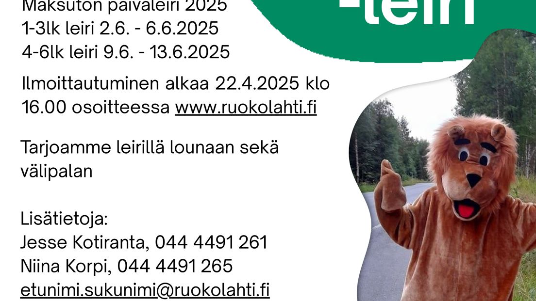 Leirit järjestetään päiväleirinä koulun ja liikuntahallin ympäristössä maanantaista perjantaihin. Leiripäivät alkavat klo 09.00 ja päivät päättyvät klo 15.00. Leijona -leirillä tutustutaan erilaisiin aktiviteetteihin. Ohjelma sisältää esimerkiksi erilaista liikunnallista tekemistä, sekä monipuolisesti erilaista toimintaa kuten askartelua ja yhdessä pelailua. Leirille mahtuu mukaan 30 ensimmäisenä ilmoittautunutta. Leiri on maksuton ja sisältää lounaan sekä pienen välipalan.